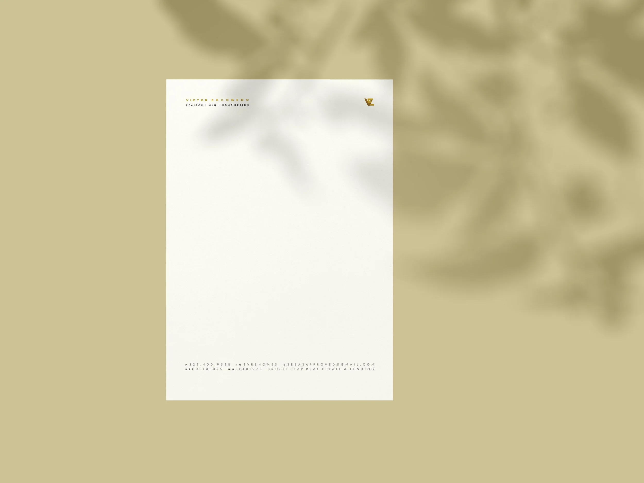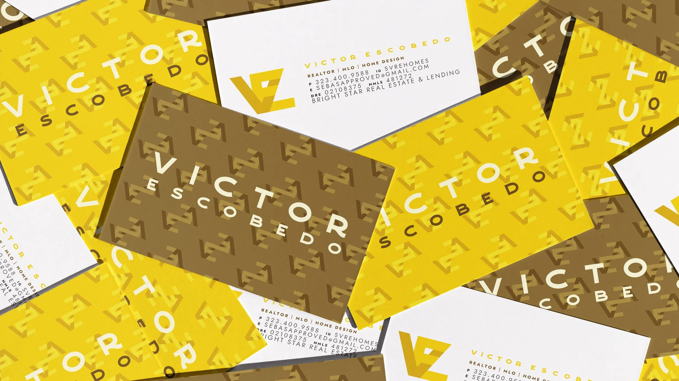 I created a bold, modern identity system for Victor Escobedo that unifies his real estate and home-design expertise into one cohesive visual language. A geometric VE monogram functions as both a standalone mark and a repeatable pattern, supported by bright colors and clean typography. The system extends across LinkedIn, business cards, and interior-pattern applications, giving Victor a distinct, elevated brand presence that stands out in a saturated market.